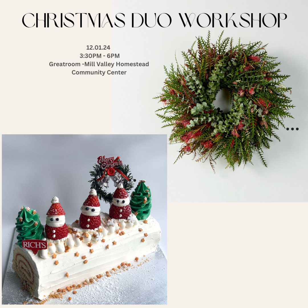Join us on December 1, 2024, from 3:30 PM to 6:30 PM for a festive workshop in collaboration with Flora Stories and Blooming Cakes! What You’ll Create: Bûche de Noël: Learn to decorate this classic French Yule log cake, perfect for holiday celebrations. Festive Wreath: Design a beautiful wreath to adorn your home and bring the spirit of the season indoors. Location: Homestead Valley Community Center, Mill Valley, CA Investment: Starting at $225 per person Why Attend? This workshop offers a delightful blend of creativity and holiday cheer, making it the perfect way to celebrate the season with friends and family. All materials will be provided, and you’ll leave with your own stunning creations!
