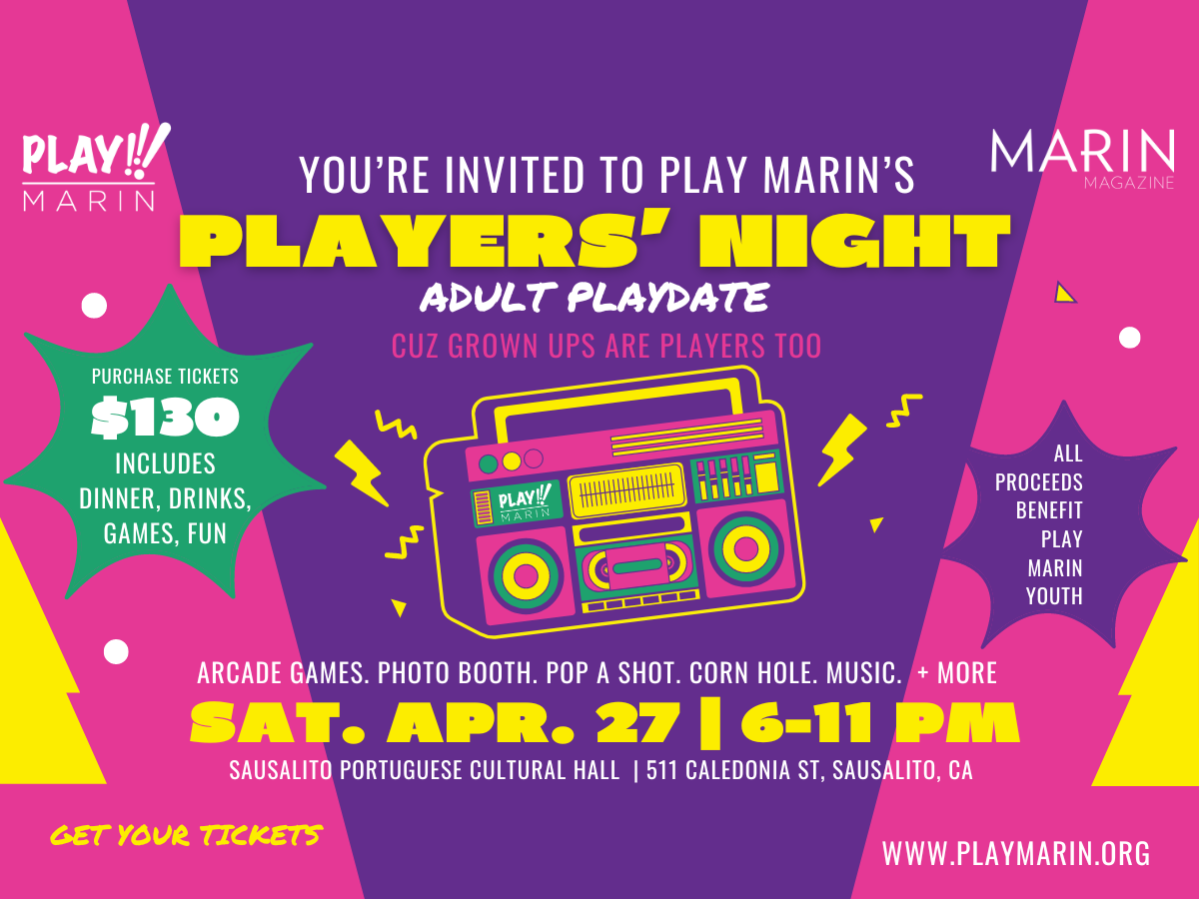 Not Your Kids’ Play Date! Invite your friends and join Play Marin for a grown-ups only Players' Night, which will put the FUN in fundraiser! When: Saturday, April 27 from 6-11 pm Where: Portuguese Cultural Hall, 511 Caledonia Street, Sausalito, CA When you come to our Players' Night you can shoot buckets, flip cups, and dance your ** off! Enjoy wine/beer/bubbles and eat delicious snacks from Dee’s Organic Catering. Bid on an amazing variety of silent auction items - all while supporting a great organization benefiting Play Marin's youth programs. So mark your calendar, bring your friends, and come have a great time at Players' Night while making a difference in the community.